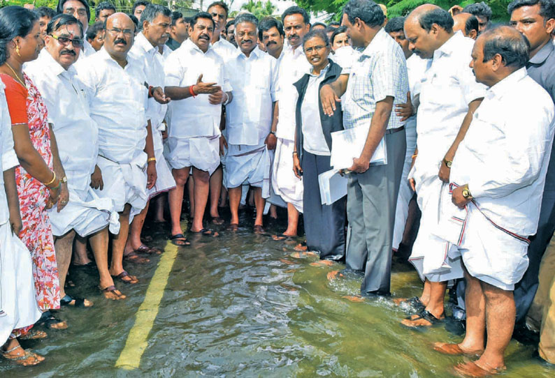 அமைச்சர்கள் குளம்போல் தேங்கிய மழைநீரில் வேஷ்டியை மடித்துக்கட்டி இறங்கி சென்று மக்களை சந்திக்கின்றனர். மக்களின் குறைகளை கேட்டறிந்து, உடனடியாக தீர்வு காணும் முயற்சியில் ஈடுபடுகின்றனர். தேங்கிய மழைநீரை விரைந்து அகற்றவும் அதிகாரிகளுக்கு உத்தரவிடுகின்றனர்.