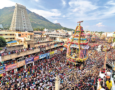 CHENNAI: Once a quiet town in northern Tamil Nadu, Tiruvannamalai has now become a potential hotspot for stampedes owing to the steady influx of devotees, particularly from Andhra Pradesh and Telangana. With every inch of space occupied with devotees, the girivalam (pilgrimage walk) path, the Arunachaleswarar temple and Tiruvannamalai railway station are showing signs of becoming potential disaster zones. The temple which witnessed large gatherings only during Karthigai Deepam and the girivalam days until 2021, is now receiving massive crowds on weekends and extended holidays as well.
